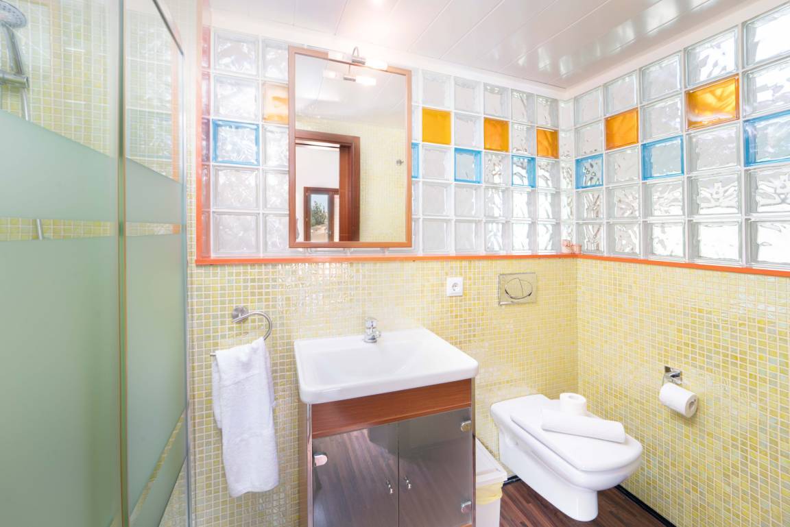 Im Erdgeschoss befinden sich zwei komfortable Schlafzimmer: eines mit einem 160-cm-Doppelbett und eines mit zwei Einzelbetten. Beide Zimmer haben direkten Zugang zum Garten und Poolbereich und teilen sich ein modernes Badezimmer sowie eine separate Toilette.
