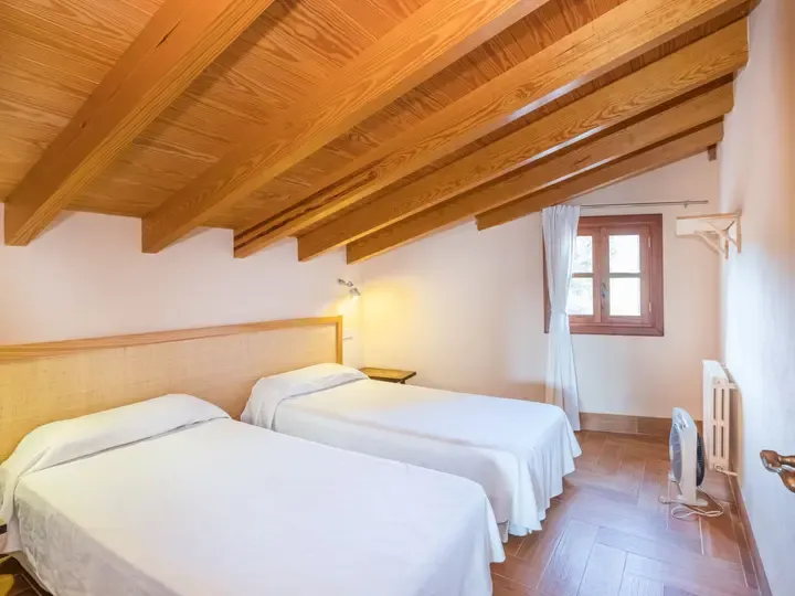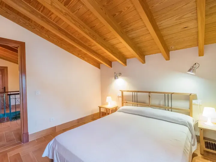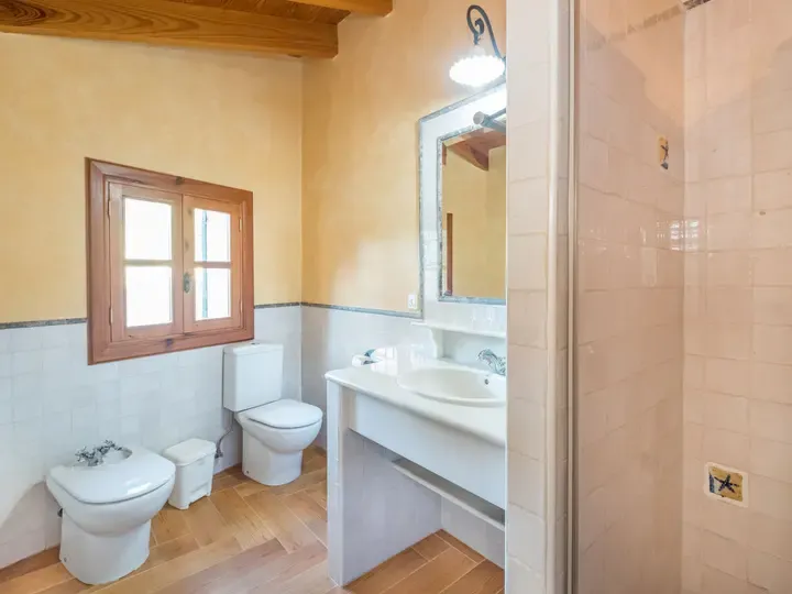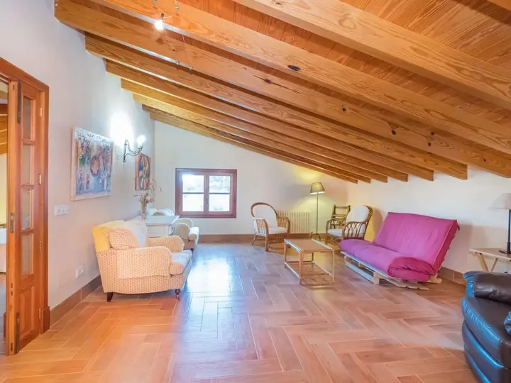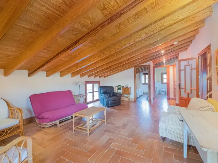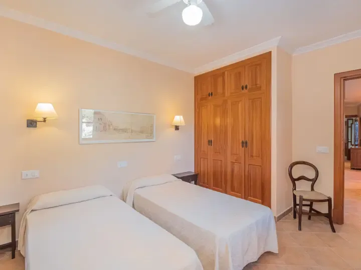 Die Finca verfügt über vier Schlafzimmer (davon zwei mit französischem Bett, zwei mit Einzelbetten), zwei moderne Bäder, ein separates WC sowie ein zusätzliches Wohnzimmer im Obergeschoss – ideal für größere Familien oder mehrere Generationen.