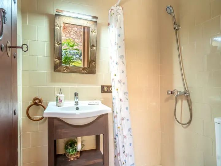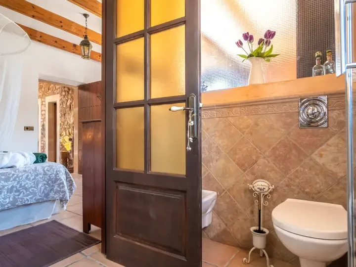 Drei gemütliche Schlafzimmer, jeweils mit französischem Doppelbett (150 cm oder 160 cm breit), und drei moderne Bäder mit Dusche/WC sorgen für Komfort auf höchstem Niveau. Eines der Schlafzimmer befindet sich im Nebengebäude (Obergeschoss mit Außentreppe) – ideal für Paare oder Familienmitglieder, die mehr Unabhängigkeit schätzen.