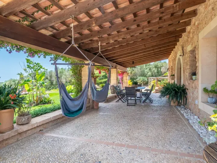 Von der Terrasse genießen Sie eine wunderschöne Panoramasicht auf die mallorquinische Landschaft – ein absoluter Wohlfühlmoment bei Sonnenuntergang mit einem Glas Wein aus der Region.