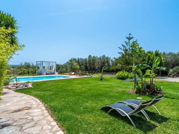Das Herzstück dieser Finca ist der gepflegte, große Garten mit Rasen, Blumen, Bäumen und liebevoll angelegten Sitzbereichen. Der 10 x 4 Meter große Pool mit umweltfreundlichem Salzwassersystem ist zur Alleinnutzung und verspricht erfrischende Abkühlung an heißen Sommertagen. Sonnenliegen, eine überdachte Laube mit Grillplatz, eine Pergola sowie ein Kinderspielplatz bieten jede Menge Raum zum Entspannen, Spielen oder geselligen Beisammensein.