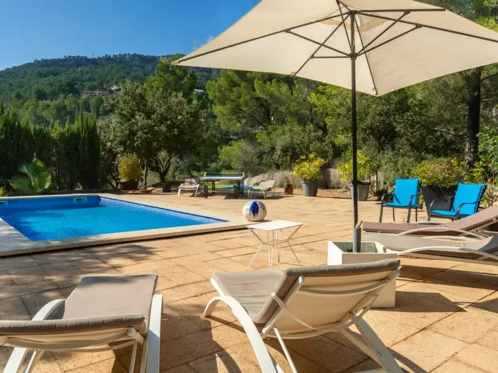 - Große Terrasse (130 m²) mit überdachtem Sitzbereich, Liegestühlen und Sonnenschirmen – ideal für entspannte Stunden mit Blick auf die Tramuntana-Landschaft.