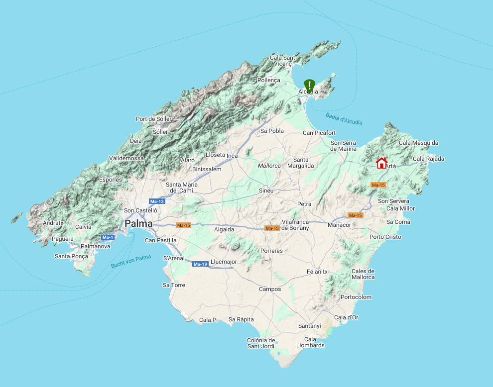 Die Finca liegt ländlich und ruhig. Mit dem Auto erreicht man in ca. 15 Minuten Artà, wo man alle nötigen Geschäfte und einige Restaurants findet.