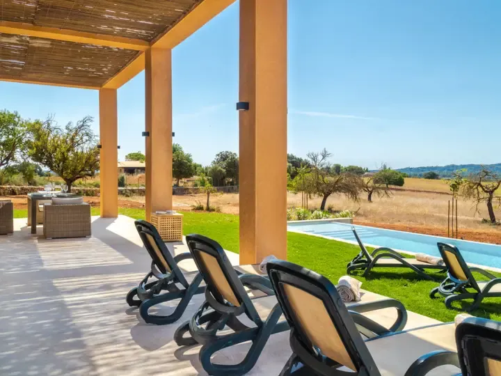 Die Villa verfügt über einen großzügigen Garten mit Rasenflächen, Palmen und mediterranen Pflanzen, die Privatsphäre garantieren. Eine romantische Pergola, ein Grillbereich mit Cerankochfeld und bequeme Sitzplätze machen den Außenbereich zum Herzstück für gesellige Stunden. Der private Pool lädt zu erfrischenden Momenten ein, während Sie den Blick auf die sanfte Hügellandschaft Mallorcas genießen.