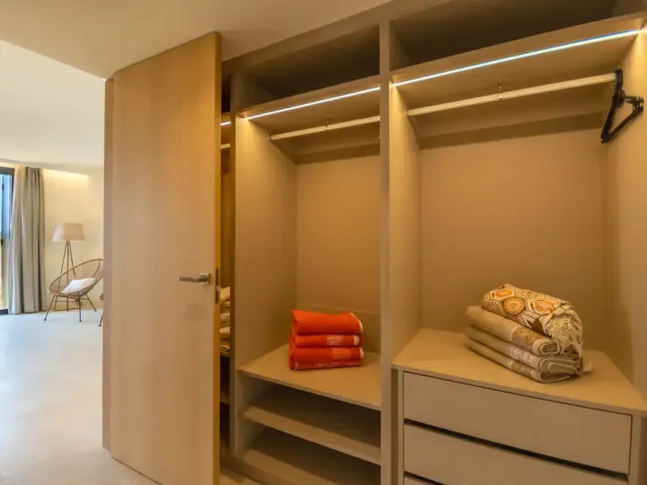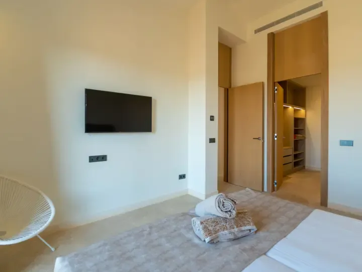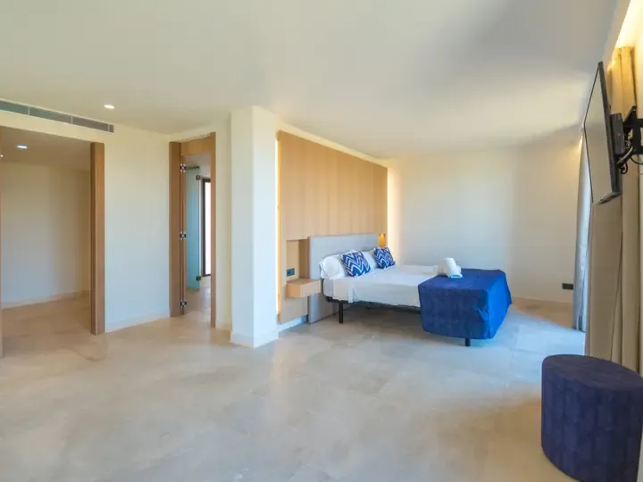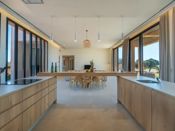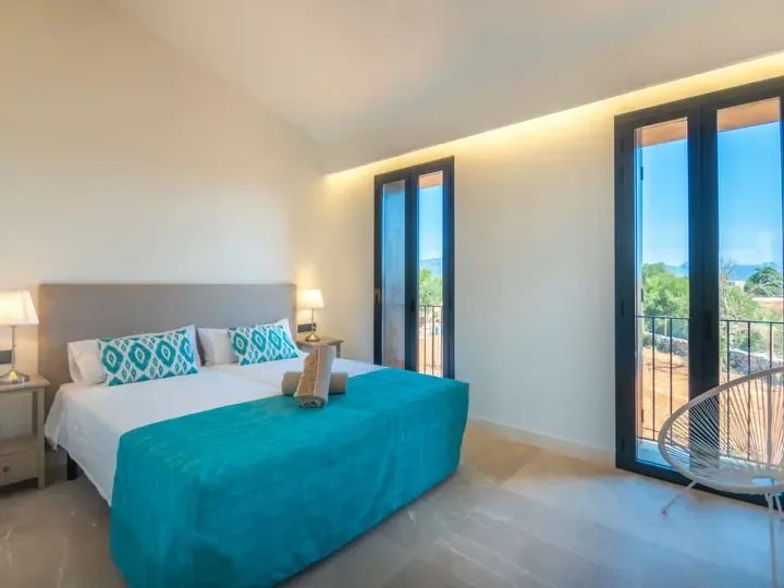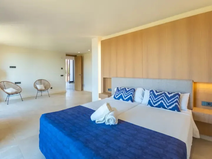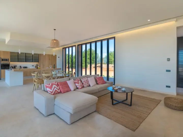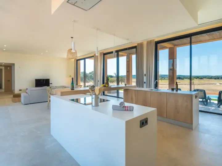 Die Villa Can Navarro wurde modern eingerichtet und bietet ein großzügiges Raumgefühl. Das lichtdurchflutete Wohn-/Esszimmer lädt zum Verweilen ein, während die offene Küche mit Kochinsel den idealen Platz für gemeinsame Mahlzeiten bietet. Die Schlafzimmer verfügen über Panoramafenster, begehbare Kleiderschränke und moderne Bäder – teilweise mit Hydromassage-Dusche. Jedes Zimmer ist klimatisiert und sorgt auch in den Sommermonaten für angenehme Temperaturen.